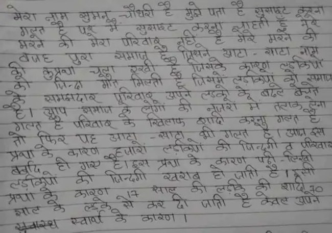 मेरा नाम सुमन चौधरी है। मुझे पता है सुसाइड करना गलत है, पर मैं सुसाइड करना चाहती हूं। मेरे मरने की वजह मेरा परिवार नहीं, पूरा समाज है। जिसने आटा-साटा नाम की कुप्रथा चला रखी है। इसके कारण लड़कियों को जीते जी मौत मिलती है। इसमें लड़कियों को समाज के समझदार परिवार अपने लड़कों के बदले बेच देते हैं।