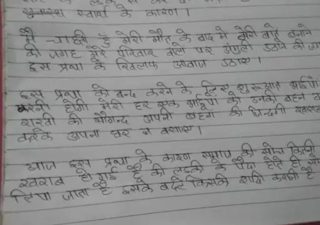 मैं चाहती हूं कि मेरी मौत के बाद मेरी बातें बनाने की जगह, मेरे परिवार वालों पर उंगली उठाने की जगह, इस प्रथा के खिलाफ आवाज उठाएं। इस प्रथा को बंद करने के लिए शुरुआत भाइयों को करनी होगी। मेरे हर एक भाई को अपनी बहन और राखी की सौगंध, अपनी बहन की जिंदगी खराब करके अपना घर न बसाएं।