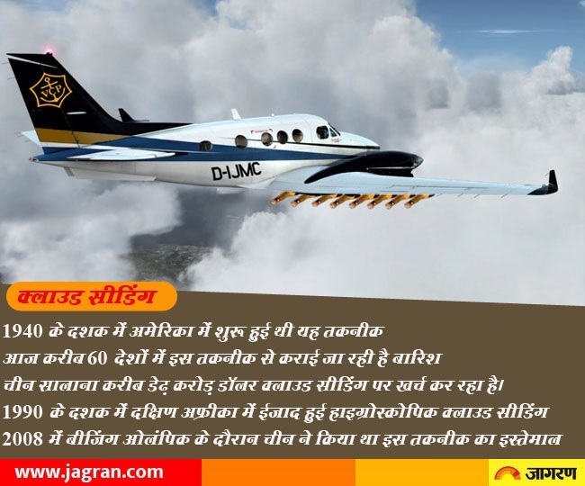 क्लाउड सीडिंग एक आर्टिफिशियल बारिश कराने का एक तरीका है। इसमें सिल्वर आयोडाइड या ड्राई आइस को हवाई जहाज की मदद से बादलों पर छोड़ा जाता है। इसमें छोटे कणों को बादलों के बहाव के साथ छिड़क दिया जाता है। ये कण हवा से नमी को सोखते हैं और इसके बाद वो कंडेंस होकर इसके द्रव्यमान को बढ़ा देते हैं। इसके बाद बादलों से बारिश की मोटी बूंदे बनती हैं और बरसने लगती हैं।