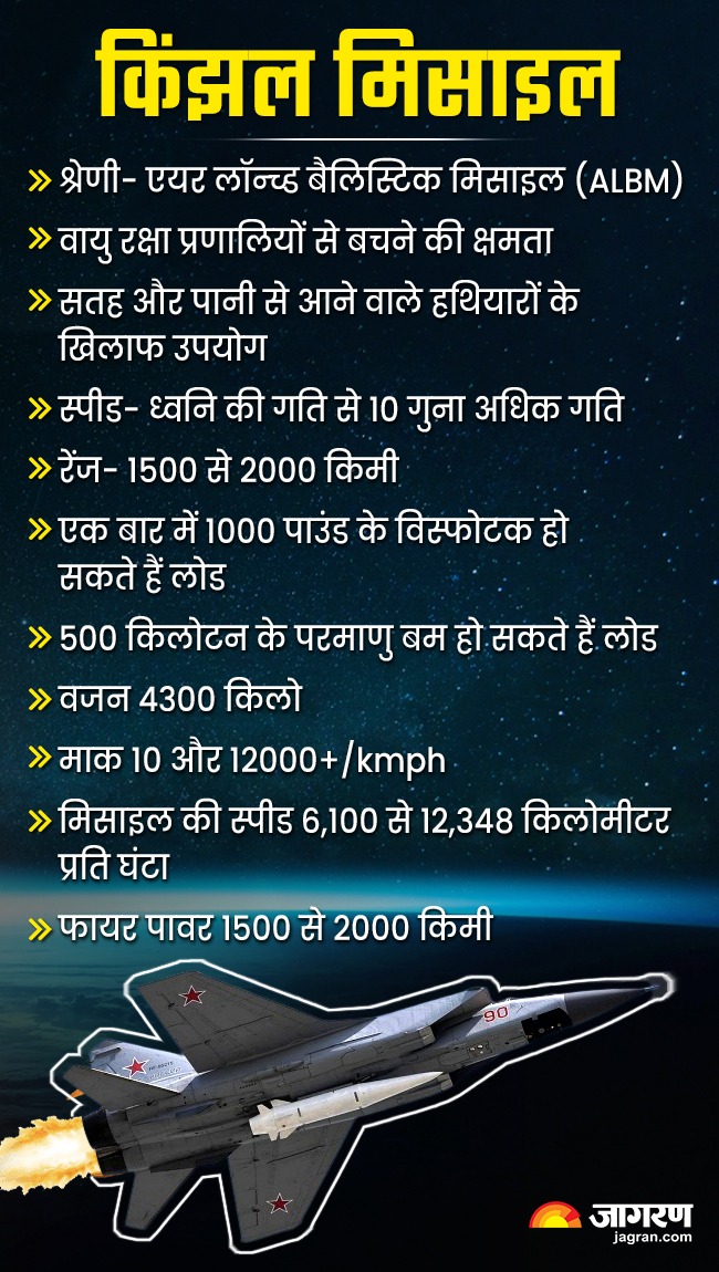 रूस की किंझल मिसाइल 1 सेकंड में 3 किलोमीटर की स्पीड से अपने टारगेट पर हमला कर सकती है। हाल ही में रूसी मीडिया ने कंफर्म किया कि रूस ने यूक्रेन के लवीव शहर पर किंझल सुपरसोनिक मिसाइलों से हमला किया था। इस हमले के पीछे रूस का उद्देश्य यूक्रेन एयर डिफेंस को तबाह करना था। इस मिसाइल को रूस ने Mig-31k और Tu-22M3 फाइटर एयरक्राफ्ट में तैनात किया है।