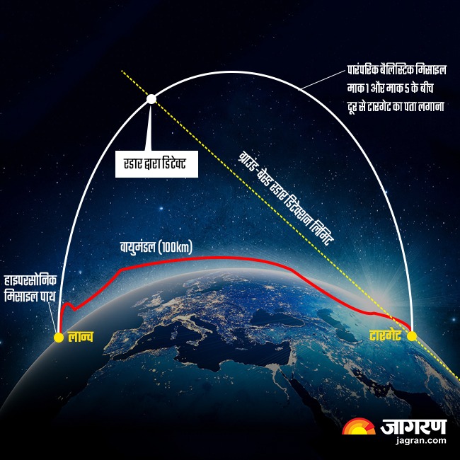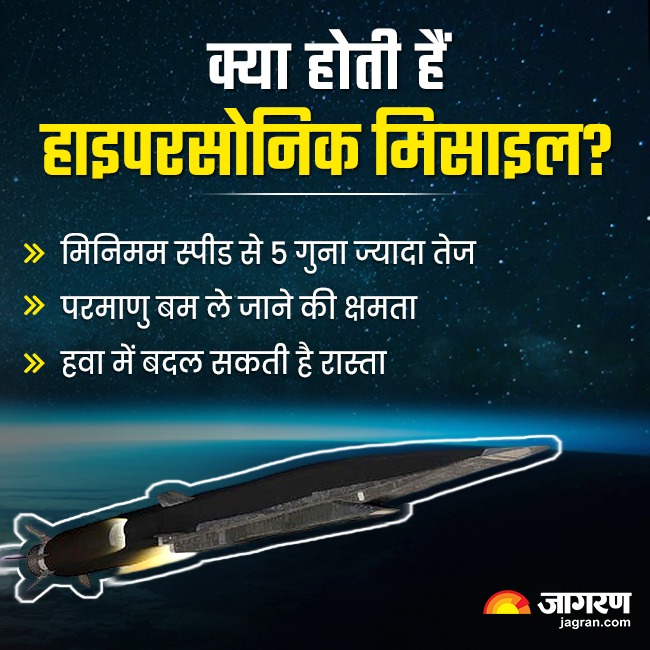 हाइपरसोनिक मिसाइल वह मिसाइल होती है जिनकी मिनिमम स्पीड साउंड से 5 गुना ज्यादा तेज होती है। यह मिसाइल अपने साथ परमाणु बम ले जा सकती हैं और हवा में कभी भी अपना रास्ता बदल सकती हैं। वहीं, बैलिस्टिक मिसाइल लक्ष्य की ओर लॉन्च होने से पूर्व एक पारंपरिक रॉकेट के माध्यम से पहले वायुमंडल में जाती हैं, जबकि हाइपरसोनिक क्रूज़ मिसाइल अपने लक्ष्य तक पहुंचने से पहले वायु की मदद से उच्च गति इंजन या 'स्क्रैमजेट' द्वारा संचालित होती है।