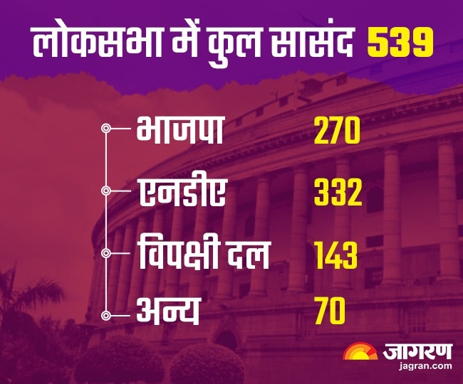 लोकसभा में फिलहाल 539 सांसद सदस्य मौजूद हैं। वर्तमान में लोकसभा में बहुमत का आंकड़ा 270 है। वहीं, अकेले भाजपा के पास फिलहाल 301 सांसद सदस्य मौजूद हैं। वहीं, उनके सहयोगी दल एनडीए के पास 31 सांसद हैं। विपक्षी दल यानी 'इंडिया' के पास 143 सीटें हैं। इसके अलावा, केसीआर की बीआरएस, वाईएस जगन रेड्डी की वाईएसआरसीपी और नवीन पटनायक की बीजेडी जैसी पार्टियों के पास 70 सांसद हैं।
