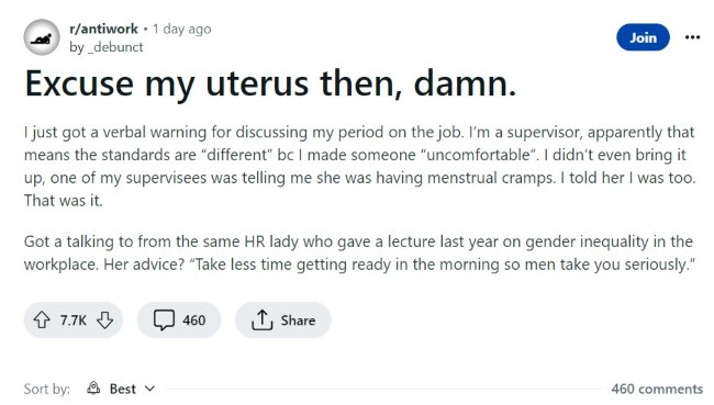 पोस्ट को '_debunct14' नाम के यूजर ने शेयर किया था। जिसमें उन्होंने लिखा, मुझे काम पर अपने पीरियड्स के बारे में चर्चा करने के लिए एक मौखिक चेतावनी दी गई है। मैं एक पर्यवेक्षक (Supervisor) हूं, जाहिर है, इसका मतलब है कि मानक 'अलग' हैं क्योंकि मैंने किसी को 'असुविधाजनक' बना दिया है। मैंने इस मुद्दे को उठाया ही नहीं, मेरी एक पर्यवेक्षक मुझे बता रही थी कि उसे मासिक धर्म में ऐंठन हो रही थी। मैंने उससे कहा कि मेरे साथ भी ऐसा ही हो रहा था। बस इतनी ही बात हुई था।