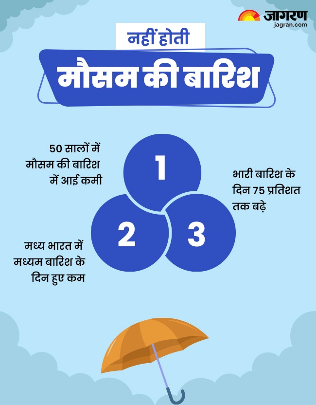 मौसम विभाग के मुताबिक, पिछले 50 सालों में मौसमी बारिश में लगभग 6 प्रतिशत तक की कमी आई है। मध्य भारत में मध्यम बारिश के दिन कम हो गए हैं और बहुत ज्यादा बारिश के दिन बढ़ गए हैं। भारी बारिश वाले दिन 75 प्रतिशत तक बढ़ गए (150 मिमी प्रति दिन)।