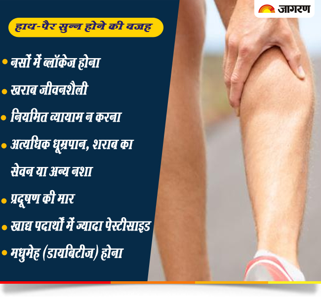 चिकित्सकों के अनुसार हाथ-पैर का सुन्न होना या नसों में ब्लॉकेज की वजह अमूमन हमारी खराब जीवनशैली होती है। इसमें नियमित व्यायाम न करना। धूम्रपान, शराब का सेवन या अन्य तरह का नशा करना। प्रदूषण, खाद्य पदार्थों में अत्यधिक पेस्टीसाइड का इस्तेमाल और मधुमेह प्रमुख वजह है। डॉक्टरों को एक अध्ययन में 23 फीसद लोगों के पैरों की नसों में ब्लॉकेज मिला। 40 फीसद लोगों के गले की नस में ब्लॉकेज मिला, जिससे उन्हें ब्रेन स्ट्रोक हो गया।