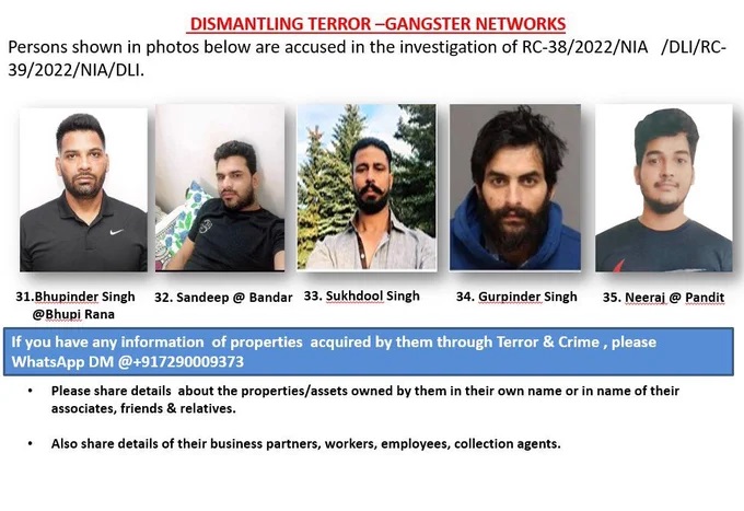 एनआईए ने गोल्डी बरार, राजेश कुमार, प्रिंस, अनिल वी और मोहम्मद शाहबाज की तस्वीरें उनके नाम के साथ जारी की हैं और इनके जरिए बताया गया है कि इनमें से कई गैंगस्टर कनाडा में रह रहें हैं।