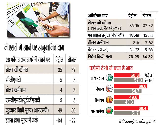 पेट्रोल पर एक्साइज ड्यूटी में 105. 49 फीसदी और डीजल में 240 फीसदी की बढ़ोतरी हुई। दरअसल, फिलहाल पेट्रोल डीजल में कई सारे टैक्स शामिल हैं। मसलन, एक्साइज ड्यूटी और वैट (मूल्य संवर्धित कर)। इसके अलावा डीलर की ओर से लगाया गया रेट और कमीशन भी कीमतों में जुड़ते हैं। एक्साइज ड्यूटी तो केंद्र सरकार लेती है, जबकि वैट राज्यों की आमदनी (राजस्व) में जुड़ता है।
