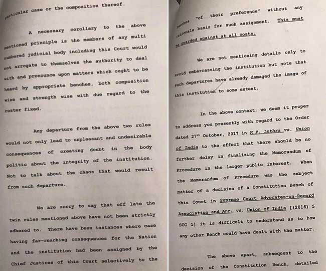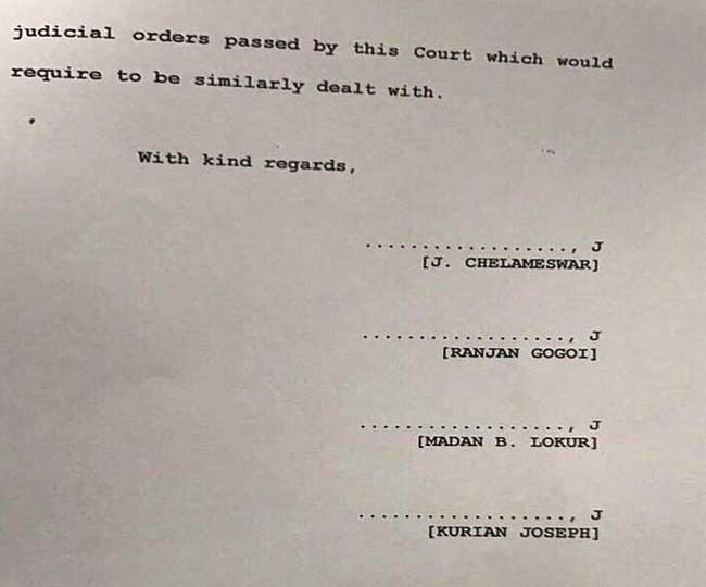 जस्टिस चेलमेश्वर और जस्टिस कुरियन जोसेफ ने कहा कि हम वह पत्र सार्वजनिक करेंगे, जिससे पूरी बात स्पष्ट हो जाए। चेलमेश्वर ने कहा, '20 साल बाद कोई यह न कहे कि हमने अपनी आत्मा बेच दी है। इसलिए हमने मीडिया से बात करने का फैसला किया।' उन्होंने कहा कि भारत समेत किसी भी देश में लोकतंत्र को बरकरार रखने के लिए यह जरूरी है कि सुप्रीम कोर्ट जैसी संस्था सही ढंग से काम करे।