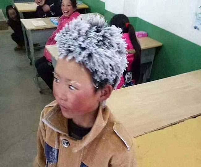 चीन में तो कुछ जगहों पर तो पारा इतना नीचे लुढ़क गया कि सड़कों पर बर्फ की मोटी चादर बिछ गई और यहां इस छोटे बच्चे के सिर के बाल जम गए। चीन के शिंजी प्रांत में बीते दिनों दस वर्षीय बालक जब अपनी कक्षा में दाखिल हुआ तो उसके सिर के बाल पूरी तरह बर्फ में जमे हुए थे। दरअसल तीसरी कक्षा में पढ़ने वाला यह छात्र तकरीबन पांच किमी दूर से पैदल चलकर आता था। स्कूल में परीक्षाएं चल रही थीं, इसलिए ठंड होने के बावजूद भी वह स्कूल के लिए निकला। लेकिन रास्ते में अचानक तापमान तेजी से नीचे गिर गया। ऐसे में बच्चे के सिर के बाल जम गए। लिहाजा पहले उसे गर्म तापमान में रखा गया और फिर परीक्षा ली गई।