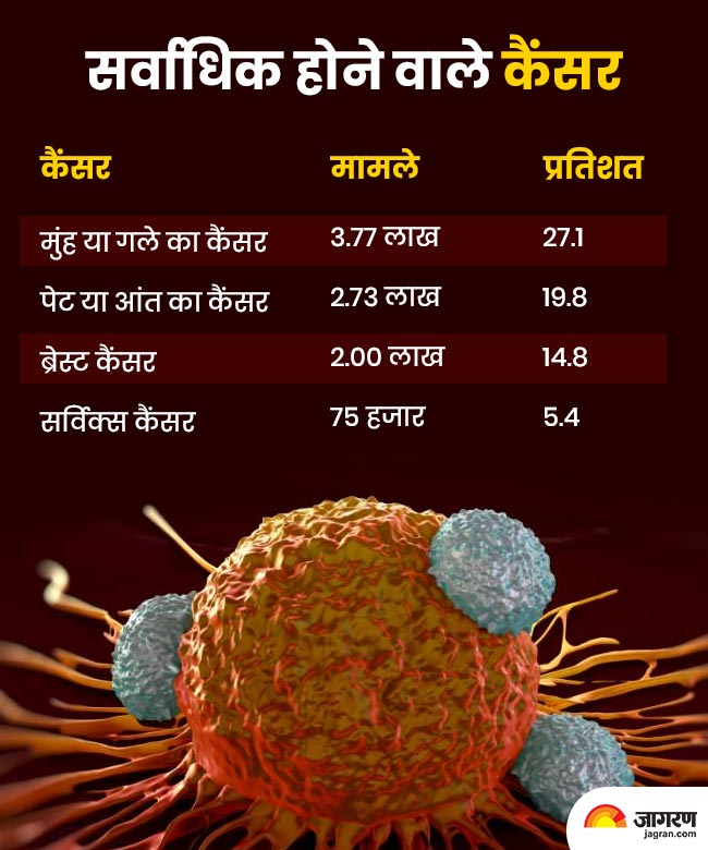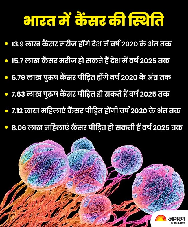 नेशनल कैंसर रजिस्ट्री प्रोग्राम की रिपोर्ट के अनुसार वर्ष 2025 तक भारत में कैंसर के मामले 12 फीसद तक बढ़ेंगे। इस साल के अंत तक भारत में कैंसर मरीजों की संख्या 14 लाख पार होगी, जो 2025 तक 16 लाख पहुंच सकती है। ICMR के अनुसार इस वर्ष देश में कैंसर के कुल मामलों में से 27.1 फीसद (करीब 3.77 लाख) मामले तंबाकू से होने वाले कैंसर के, 19.8 प्रतिशत (करीब 2.73 लाख) मामले पेट के कैंसर के, 14.8 फीसद (करीब दो लाख) मामले महिलाओं में ब्रेस्ट कैंसर के और 5.4 प्रतिशत (75 हजार मामले) सर्विक्स कैंसर के रहने का अनुमान है। रिपोर्ट के मुताबिक आने वाले समय में पुरुषों में फेफड़े, मुंह, पेट व आंत का कैंसर और महिलाओं में ब्रेस्ट व सर्विक्स कैंसर काफी तेजी से बढ़ेगा और इसकी मुख्य वजह तंबाकू होगा।