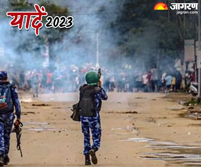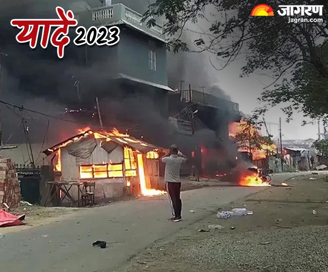मणिपुर बन गया जंग का मैदान : ये दोनों तस्वीरें मणिपुर हिंसा की हैं। मणिपुर के कुकी और मैतेई समुदायों के बीच मई महीने में जातीय संघर्ष शुरू हुआ, जो साल के अंत तक जारी रहा। इस हिंसा में 180 से अधिक लोग मारे गए। 32 लोग अभी भी लापता हैं और 1108 लोग घायल हुए। हिंसा में 4,786 घर फूंक दिए। 386 धार्मिक स्थल ध्वस्त कर दिए गए। 70 हजार से ज्यादा लोगों को अपने घर छोड़ने पड़े। मुर्दाघर में अभी भी 169 शव रखे हैं, जिन्हें कोई लेने नहीं आया।