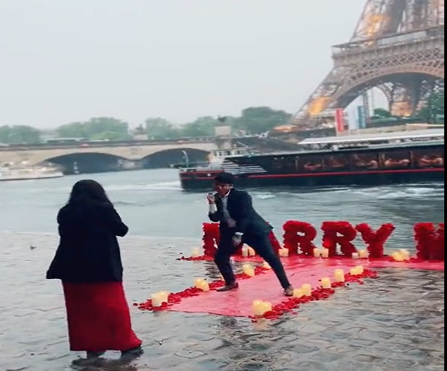 ऐसा ही एक मैरिज प्रपोजल वीडियो इन दिनों सोशल मीडिया पर तेजी से वायरल हो रहा है। इस वीडियो में पैरिस के एफिल टावर के सामने सूट-बूट पहने एक लड़के ने अपनी प्रेमिका को अनोखे अंदाज में प्रपोज किया। यह लड़का अपनी गर्लफ्रेंड को 'मैरी मी' का एक रेड बैनर लगाकर और रेड कारपेट बिछाकर उस पर डांस करते हुए प्रपोज करता हुआ नजर आ रहा है।