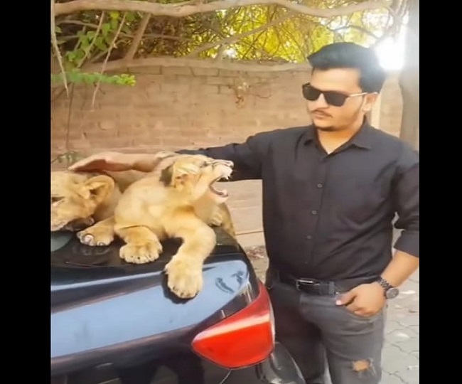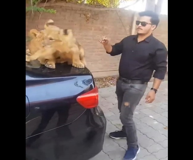 इन दिनों सोशल मीडिया पर वायरल हो रहा एक वीडियो अपने आप में डराने वाला सामने आया है। इस क्लिप में एक आदमी और दो शेर बच्चे दिखाई दे रहे हैं। वीडियो में जहां शेर के बच्चे कार की डिक्की पर बैठे नजर आ रहे हैं, वहीं पास में खड़ा यह शख्स शेर के बच्चों के सर पर अपने हाथ फेरता हुआ नजर आ रहा है।