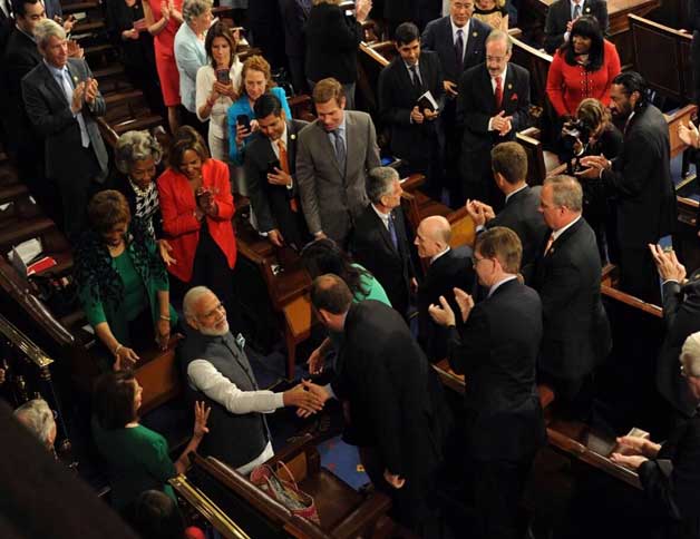 मोदी ने भाषण की शुरुआत करते हुए अमेरिकी संसद के बारे में कहा कि लोकतंत्र के इस मंच ने दुनियाभर के अन्य लोकतंत्रों को साहस और ताकत दी है। जब मोदी ने कहा कि गांधी की अहिंसा ने मार्टिन लूथर किंग को प्रेरणा दी, तब संसद सदस्यों ने खड़े होकर उनका अभिवादन किया।