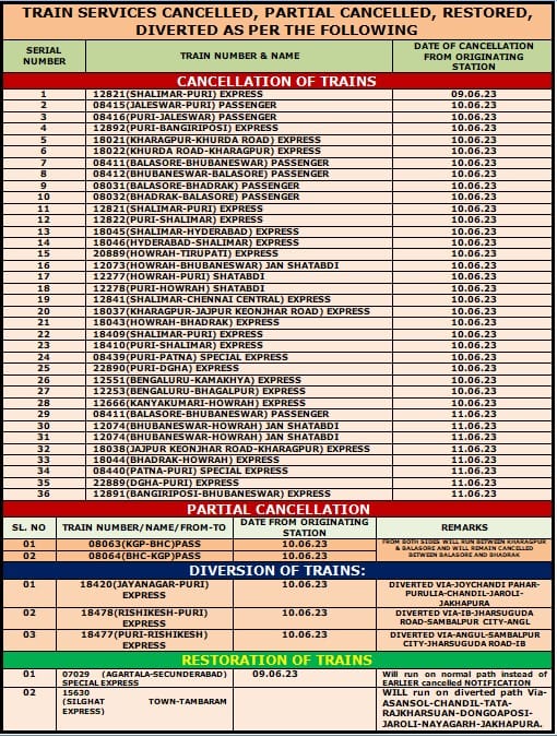 Odisha Train Accident हादसे ने पिछले एक सप्ताह से ट्रेन सेवाओं को बुरी तरह प्रभावित किया है। रेलवे द्वारा शुक्रवार को साझा की गई जानकारी के मुताबिक मेंटेनेंस की वजह से 9 10 और 11 जून को 36 ट्रेनों को रद्द किया गया है।