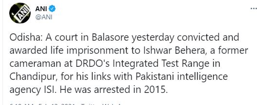 बालेश्वर, जागरण संवाददाता। प्रतिरक्षा विभाग की गुप्त सूचना एजेंट को बेचने के आरोप में 2015 में गिरफ्तार होने वाला चांदीपुर आइटीआर में ठेके पर नियुक्त वीडियोग्राफर मयूरभंज जिले के कंटीपुर इलाके का रहने वाला ईश्वर बेहेरा को बालेश्वर अतिरिक्त जिला एवं दौरा जज ने गुरुवार को दोषी साबित करने के साथ ही आजीवन कारावास से दंडित किया है। इस मामले में सभी गवाह प्रमाण एवं दस्तावेज के आधार पर अतिरिक्त जिला एवं दौरा जज गिरजा प्रसाद महापात्र ने ईश्वर को आजीवन सश्रम कारावास की सजा सुनाने के साथ ही 10 हजार रुपए का जुर्माना लगाया है।