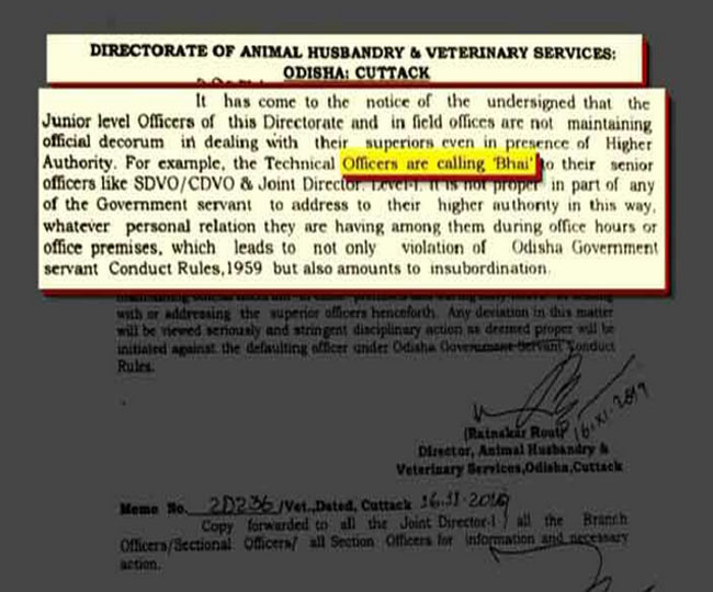 भुवनेश्वर, जेएनएन। सरकारी दफ्तर में चलते समय अपने सीनियर को भाई कहकर बुलाते हैं या सम्बोधित करते हैं तो अब सावधान हो जाइए क्योंकि ऐसा करने पर अब आपके खिलाफ सख्त कार्रवाई की जाएगी। राज्य मछली एवं पशुपालन विभाग की तरफ से यह सख्त निर्देशनामा जारी किया गया है। मछली एवं पशुपालन विभाग के निदेशक रत्नाकर राउत ने यह निर्देशनामा जारी किया है। उन्होंने कहा कि सरकारी निर्देशनामा भंग होने के चलते यह निर्देश जारी किया गया है।