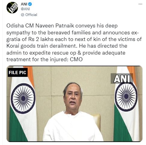 ओडिशा के सीएम नवीन पटनायक ने शोक संतप्त परिजनों के प्रति अपनी गहरी संवेदना व्यक्त करते हुए कोरई मालगाड़ी दुर्घटना के पीड़ितों के परिजनों को 2-2 लाख रुपए की अनुग्रह राशि देने की घोषणा की है। उन्होंने प्रशासन को बचाव कार्य में तेजी लाने और घायलों को पर्याप्त उपचार मुहैया कराने के निर्देश दिए हैं।