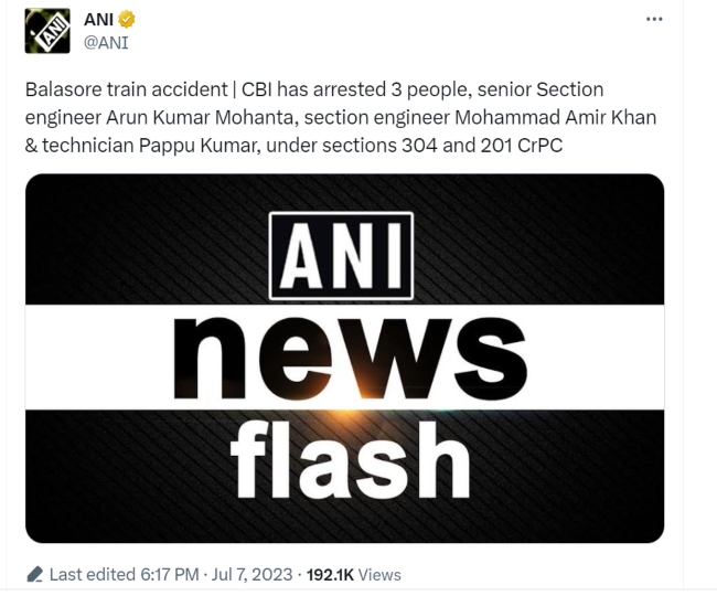 केंद्रीय जांच ब्यूरो (सीबीआई) ने 2 जून को हुई घातक बालेश्वर ट्रेन दुर्घटना के सिलसिले में गिरफ्तार किए गए तीनों रेलकर्मियों को 7 जुलाई शुक्रवार की शाम को विशेष अदालत में पेश किया। आरोपियों से पूछताछ करने के लिए 5 दिन की रिमांड पर लेने के लिए भी आवेदन किया। तीनों को आईपीसी की धारा 304 और 201 के तहत गिरफ्तार किया गया है।