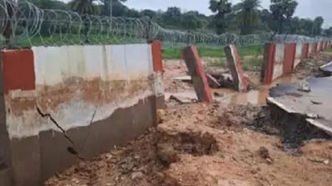 भारी बारिश होने की वजह से एयरपोर्ट की दीवार ढही।
