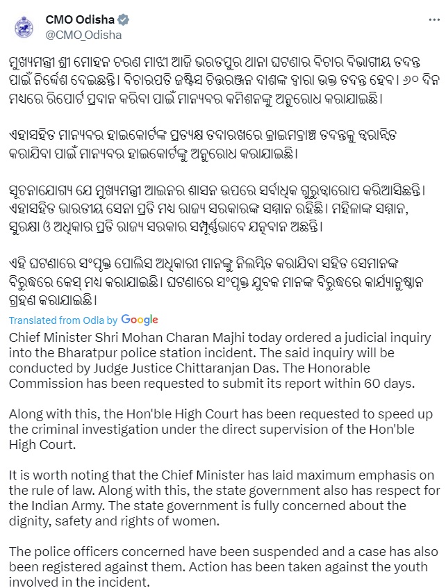 ओडिशा सीएमओ ने सोशल मीडिया प्लेटफॉर्म एक्स पर जानकारी, "मुख्यमंत्री मोहन चरण माझी ने आज भरतपुर पुलिस स्टेशन घटना की न्यायिक जांच के आदेश दिए। उक्त जांच न्यायाधीश न्यायमूर्ति चित्तरंजन दास द्वारा की जाएगी। आयोग से 60 दिनों के भीतर अपनी रिपोर्ट सौंपने का अनुरोध किया गया है।"