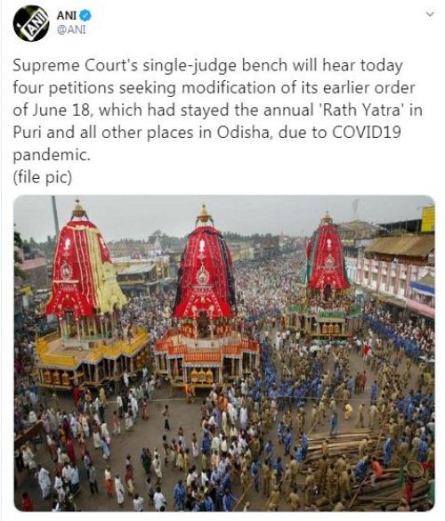 गौरतलब है कि 18 जून को सुप्रीम कोर्ट ने अपने फैसले में कहा था कि महाप्रभु श्री जगन्नाथ जी की विश्व प्रसिद्ध रथयात्रा इस साल नहीं होगी। काफी समय से कोरोना संक्रमण जैसी महामारी के कारण इस साल रथयात्रा होगी या नहीं उस पर अनिश्चितता लगी हुई थी, जिस पर आज सुप्रीमकोर्ट ने सुनवाई कर यह महत्वपूर्ण निर्णय लिया था। सुप्रीमकोर्ट के प्रधान न्यायाधीश जस्टिस एस ए बोबडे की अध्यक्षता में बैठी तीन सदस्यीय खंडपीठ ने इस मामले की सुनवाई की थी। लोगों की सुरक्षा एवं जनहित के लिए रथयात्रा को इस साल बंद करने की बात न्यायाधीश ने कही थी। सुप्रीमकोर्ट के प्रधान न्यायाधीश ने कहा था कि यदि सुप्रीमकोर्ट रथयात्रा करने की अनुमति देती है तो फिर भगवान जगन्नाथ हमें क्षमा नहीं करेंगे। केवल पुरी नहीं, बल्कि इस साल पूरे ओडिशा में किसी भी जगह पर रथयात्रा नहीं निकाली जाएगी।