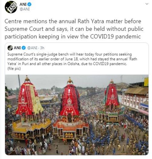 केंद्र ने सुप्रीम कोर्ट के समक्ष वार्षिक रथ यात्रा मामले का उल्लेख किया और कहा, यह COVID19 महामारी को ध्यान में रखते हुए सार्वजनिक भागीदारी के बिना आयोजित किया जा सकता है।