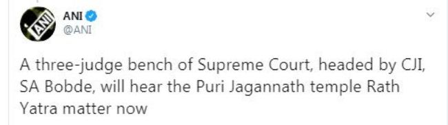 सुप्रीम कोर्ट के प्रधान न्यायाधीश एसए बोबडे के नेतृत्व में तीन सदस्यीय खंडपीठ में पुरी रथयात्रा को लेकर सुनवाई की। तीन सदस्यीय खंडपीठ में सुप्रीम कोर्ट के मुख्य न्यायाधीश जस्टिस एसए बोबड़े, जस्टिस एएस बोपन्ना, जस्टिस दिनेश माहेश्वरी शामिल थे। पुरी के जिलाधीश बलवंत सिंह ने कहा है कि रथयात्रा को लेकर श्रीक्षेत्र धाम पूरी तरह से तैयार है। सुप्रीम कोर्ट को जो भी निर्देश का अनुपालन किया जाएगा। श्रीजगन्नाथ मंदिर के मुख्य प्रशासक डा. किशन कुमार की अध्यक्षता में स्थानीय नीलाचल भक्त निवास में रथयात्रा को लेकर बैठक हुई। इस बैठक में जिलाधीश बलवंत सिंह, पुरी एसपी उमाशंकर दास के साथ शहर के तमाम विभाग के वरिष्ठ अधिकारी उपस्थित थे।
