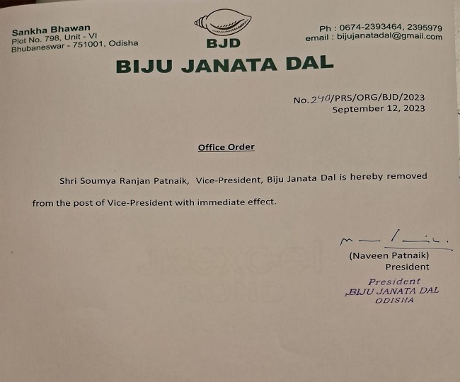 विधायक सौम्य रंजन पटनायक को पार्टी उपाध्यक्ष पद से हटाए जाने को लेकर बीजद सुप्रीमो द्वारा जारी लेटर।