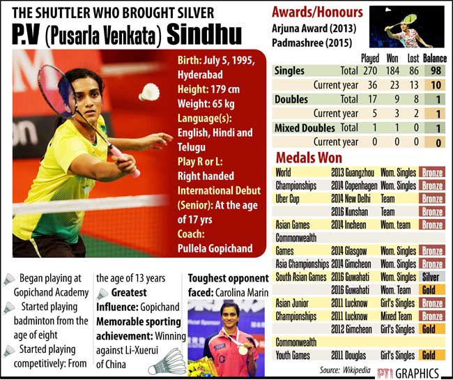 नई दिल्ली। रियो ओलंपिक 2016 में महिला सिंगल्स के फाइनल में बेशक विश्व नंबर.1 केरोलीना मारिन के खिलाफ पीवी सिंधू हार गईं लेकिन उन्होंने सिल्वर मेडल जीतकर नया इतिहास जरूर रच दिया है। आइए आपको बताते हैं पी वी सिंधू के जीवन और बैडमिंटन में उनके अबतक के सफर के बारे में कुछ दिलचस्प बातें।