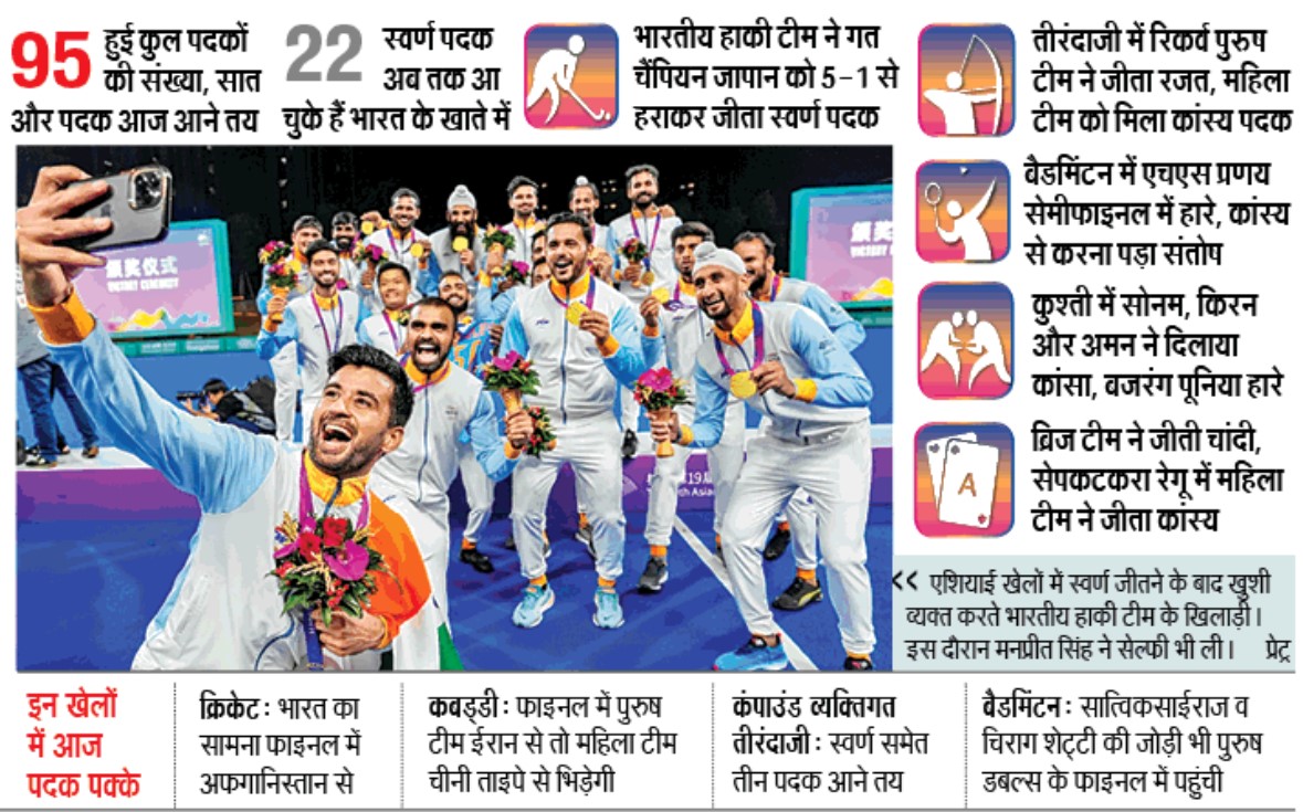 यह पहली बार है जब भारत ने एशियाई खेलों में 20 से ज्यादा स्वर्ण पदक जीते हैं। शुक्रवार को पुरुष हाकी टीम ने गत चैंपियन जापान को हराकर भारत को 22वां स्वर्ण पदक दिलाया। इसके साथ ही उसने अगले वर्ष होने वाले पेरिस ओलिंपिक के लिए क्वालीफाई कर लिया। एशियाई खेलों में भारत का सर्वश्रेष्ठ प्रदर्शन 2018 जकार्ता खेलों में रहा था।