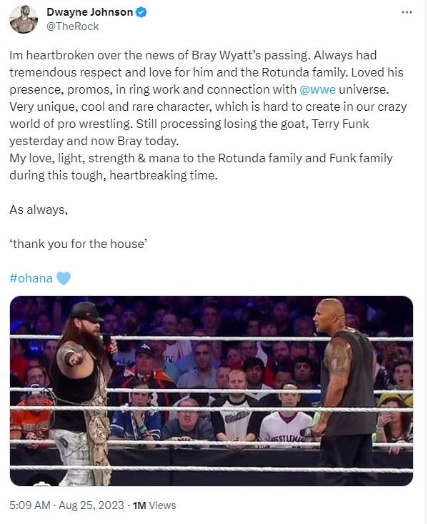द रॉक के नाम से फेमस ड्वेन जॉनसन ने दुख व्यक्त करते हुए लिखा, "ब्रे वायट के निधन की खबर से मैं बहुत दुखी हूं। उनके और रोटुंडा परिवार के लिए मेरे मन में हमेशा बहुत सम्मान और प्यार रहा है। रिंग वर्क और उनके साथ संबंध में उनकी उपस्थिति, प्रोमो बहुत पसंद आए।"