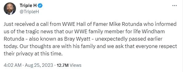ट्रिपल एच ने एक्स (जिसे पहले ट्विटर के नाम से जाना जाता था) पर लिखा, "अभी WWE हॉल ऑफ फेम माइक रोटुंडा का फोन आया, जिन्होंने हमें दुखद खबर दी कि हमारे WWE परिवार के आजीवन सदस्य विंडहैम रोटुंडा - जिन्हें ब्रे वायट के नाम से भी जाना जाता है - का आज अप्रत्याशित रूप से निधन हो गया। हमारी संवेदनाएं उनके परिवार के साथ हैं और हम उनसे प्रार्थना करते हैं। इस समय हर कोई अपनी निजता का सम्मान करता है।''