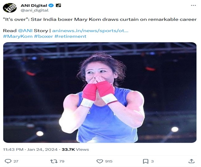 बुधवार शाम न्यूज एजेंसी एएनआई से खबर आई थी कि मेरी ने अपनी उम्र का हवाला देते हुए अपने करियर से संन्यास लेने की घोषणा की थी। अब मेरी के बयान से संन्यास को लेकर तस्वीर पूरी तरह से साफ हो गई है, जिससे पता चल गया है कि वह संन्यास नहीं ले रही हैं।
