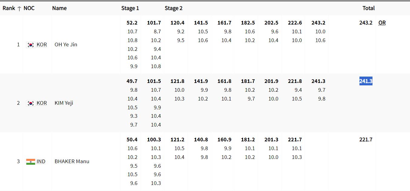 फाइनल में मनु भाकर का सामना वियतनाम, तुर्किए, कोरिया, चीन, और हंगरी के खिलाड़ियों से हुआ। पहले और दूसरे स्थान पर कोरिया की खिलाड़ी रहीं। कोरिया की जिन ने ओलंपिक रिकॉर्ड बनाते हुए 243.2 अंक हासिल किया। वहीं, दूसरे स्थान पर जिन की ही हमवतन किम येजी ने 241.3 अंक से साथ सिल्वर मेडल जीता।