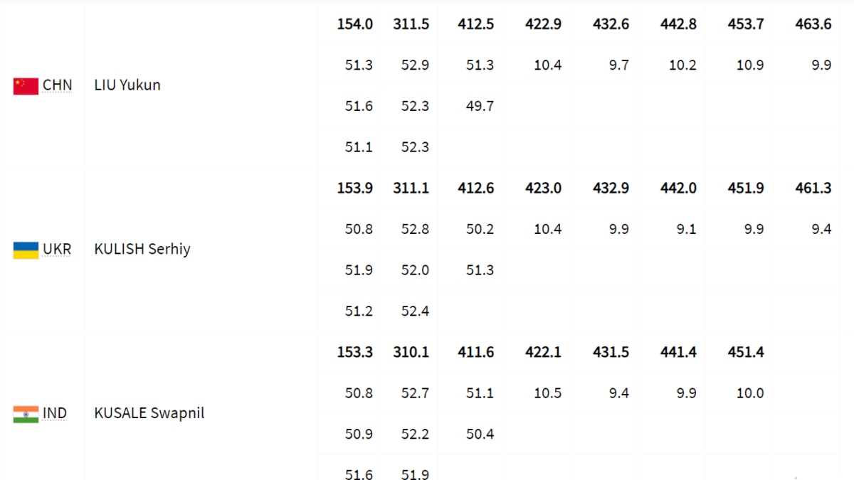 मुकाबले में स्वप्निल कुसाले की शुरुआत कुछ खास नहीं रही। उन्होंने नीलिंग में 153.3 (पहले शॉट- 50.8, दूसरे शॉट- 50.9, तीसरे शॉट- 51.6) का स्कोर किया। ऐसे में वह छठे स्थान रहे। उन्होंने प्रोन में शानदार वापसी करते हुए 156.8 (पहले शॉट- 52.7, दूसरे शॉट- 52.2, तीसरे शॉट- 51.9) स्कोर किया।