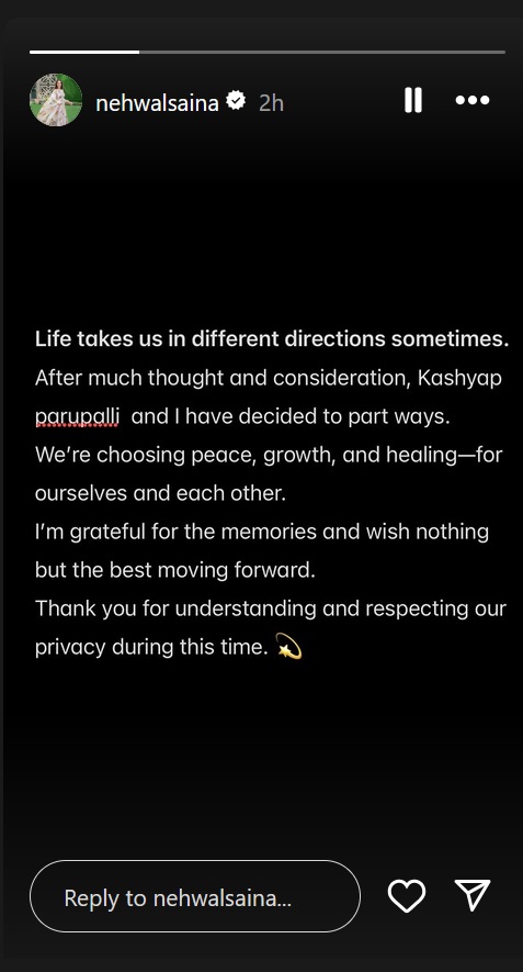 पूर्व वर्ल्ड नंबर-1 बैडमिंटन स्टार साइना ने पोस्ट में कहा, 'जिंदगी कभी-कभी हमें अलग दिशाओं में ले जाती है। काफी सोच-विचार के बाद पारुपल्ली और मैंने अलग होने का फैसला किया है। हम दोनों अपने और एक-दूसरे के लिए सुकून और तरक्की चुन रहे हैं। मैं उन यादों के लिए आभारी हूं और आगे के लिए शुभकामनाएं देती हूं। इस दौरान हमारी निजता को समझने और उसका सम्मान करने के लिए धन्यवाद।'