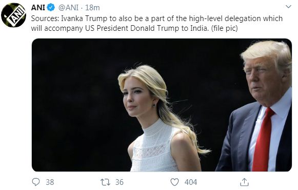 पहली बार ट्रंप के साथ उनकी बेटी इवांका भारत दौरे पर आ रही हैं। इवांका के पति जेरेड कुश्नर भी ट्रंप परिवार के साथ होंगे। यह पहला मौका होगा जब पूरा ट्रंप परिवार किसी विदेशी दौरे में एकसाथ जा रहे हैं। गौरतलब है कि इवांका ट्रंप, नवंबर 2017 में हैदराबाद आई थीं। वहां उन्होंने एक कार्यक्रम में शिरकत किया था।मीडिया रिपोर्ट्स के मुताबिक, डोनाल्ड ट्रंप, इवांका ट्रंप, और मेलानिया ट्रंप पहले अहमदाबाद और फिर आगरा की यात्रा पर जाएंगे। यहां पर वे ताजमहल देखेंगे और फिर दिल्ली देखेंगे।