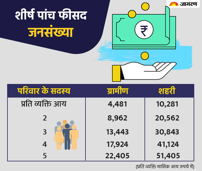 नेशनल सैंपल सर्वे ऑफिस 2011-12 की रिपोर्ट के अनुसार, शहरी और ग्रामीण दोनों क्षेत्रों में शीर्ष पांच फीसद भारतीय इससे कम कमाते हैं। इस रिपोर्ट में परिवार की आय का आकलन मासिक प्रति व्यक्ति खर्च (एमपीईसी) को मासिक आय मानते हुए किया गया है। रिपोर्ट के मुताबिक देश के दोनों (ग्रामीण और शहरी) क्षेत्रों में शीर्ष 5 फीसद जनसंख्या- यदि प्रति परिवार 5 सदस्य की गणना की जाए- तो उनकी मासिक आय 66,666 रुपये से कम आती है। एमपीईसी का यह आकलन मॉडिफाइड मिक्स्ड रेफरेंस पीरियड (एमएमआरपी) नियम से किया गया है। नीचे दिए गए चार्ट के मुताबिक यदि परिवार में पांच सदस्य हैं तो शीर्ष पांच फीसद जनसंख्या की ग्रामीण इलाकों में मासिक आय 22,405 रुपये है और शहरी इलाकों में मासिक आय 51,405 रुपये है।