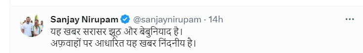 इसी बीच दिग्गज नेता संजय निरुपम को लेकर अटकलें लगाई जा रही है कि वो भी कांग्रेस का दामन छोड़ सकते हैं। हालांकि, फिलहाल संजय निरुपम ने इन सभी अटकलों पर विराम लगा दिया है। कांग्रेस नेता ने सोशल मीडिया हैंडल एक्स पर लिखा, "यह खबर सरासर झूठ और बेबुनियाद है। अफवाहों पर आधारित यह खबर निंदनीय है।"