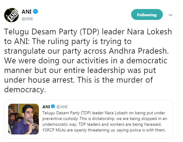 तेलुगु देशम पार्टी (टीडीपी) के नेता नारा लोकेश को नजरबंद किए जाने के बाद कहा कि यह तानाशाही है, हमें अलोकतांत्रिक तरीके से रोका जा रहा है। टीडीपी नेताओं और कार्यकर्ताओं को परेशान किया जा रहा है। वाईएसआरसीपी के विधायक खुलेआम हमें धमकी दे रहे हैं, कह रहे हैं कि पुलिस उनके साथ है। उन्होंने आगे कहा कि सत्तारूढ़ पार्टी आंध्र प्रदेश में हमारी पार्टी का गला घोंटने की कोशिश कर रही है। हम अपनी गतिविधियां लोकतांत्रिक तरीके से कर रहे थे लेकिन हमारे पूरे नेतृत्व को नजरबंद कर दिया गया। यह लोकतंत्र की हत्या है।