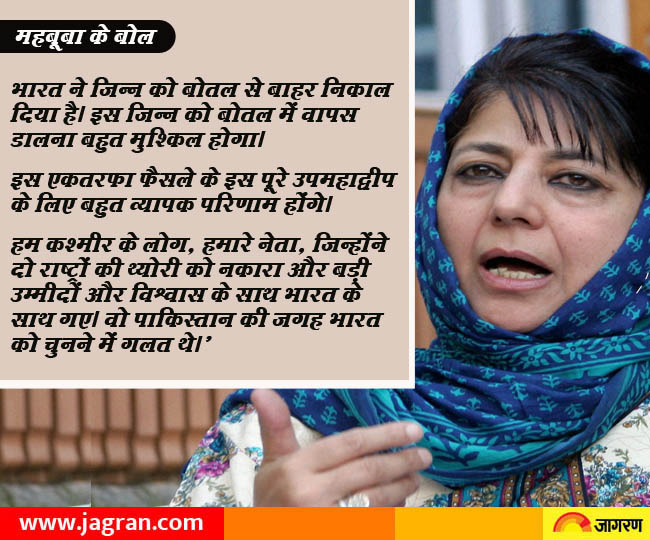 नई दिल्ली [जागरण स्पेशल]। जम्मू-कश्मीर से अनुच्छेद 370 (Article 370) व 35ए हटाए जाने के बाद पिछले 24 घंटे में देश के राजनीति माहौल में काफी उठा-पटक देखने को मिली है। कई राजनीतिक दल इसके विरोध में हैं तो वहीं जम्मू-कश्मीर के स्थानीय राजनीतिक नेताओं समेत विपक्षी पार्टियां इस ऐतिहासिक फैसले का विरोध कर रही हैं। जम्मू-कश्मीर की पूर्व मुख्यमंत्री ने कहा है कि भारत ने जिस जिन्न को बोतल से निकाल दिया है, उसे वापस डालना बहुत मुश्किल होगा। महबूबा का ये बयान ऐसे समय में पाकिस्तान को राहत देने वाला है। पाकिस्तानी प्रधानमंत्री इमरान खान ने भी महबूबा के बयान का समर्थन किया है।