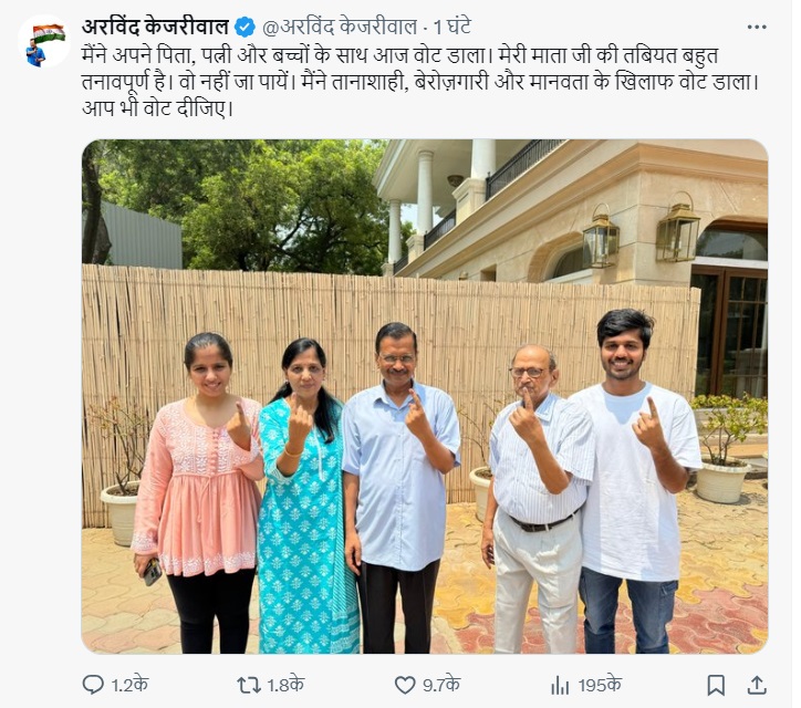 इस फोटो में वो अपनी पत्नी और बच्चों के साथ दिख रहे हैं। फोटो पोस्ट करते हुए उन्होंने लिखा,"मैंने अपने पिता, पत्नी और बच्चों के साथ आज वोट डाला। मेरी माता जी की तबियत बहुत खराब है। वो नहीं जा पाईं। मैंने तानाशाही, बेरोजगारी और महंगाई के खिलाफ वोट डाला। आप भी वोट डालने जरूर जाएं।"