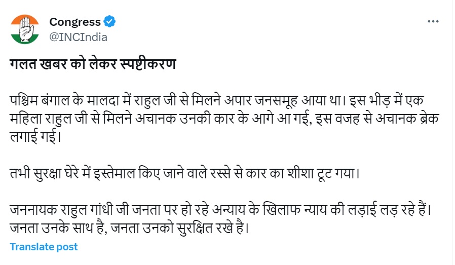 हालांकि, कुछ देर बाद कांग्रेस ने आधिकारिक सोशल मीडिया हैंडल पर कार के शीशे टूटने को लेकर जानकारी साझा की। उन्होंने लिखा, "गलत खबर को लेकर स्पष्टीकरण