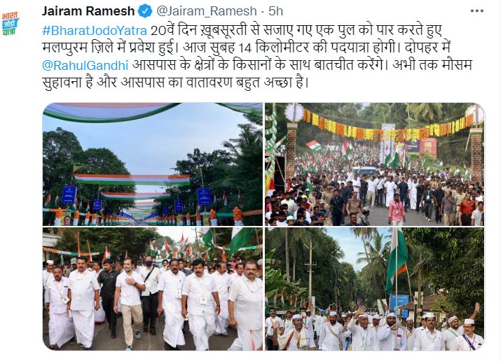 जयराम रमेश ने ट्वीट कर कहा कि 20वें दिन खूबसूरती से सजाए गए एक पुल को पार करते हुए मलप्पुरम जिले में यह भारत जोड़ो यात्रा प्रवेश हुई है। आज सुबह 14 किलोमीटर की पदयात्रा होगी। दोपहर में राहुल गांधी आसपास के क्षेत्रों के किसानों के साथ बातचीत करेंगे। अभी तक मौसम सुहावना है और आसपास का वातावरण बहुत अच्छा है।