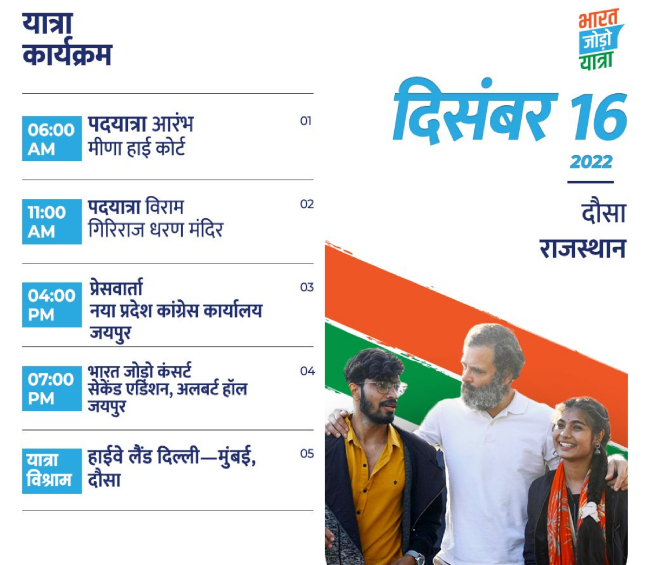 राहुल गांधी ने सितंबर महीने में तमिलनाडु के कन्याकुमारी से 'भारत जोड़ो यात्रा' की शुरुआत की थी। ये यात्रा शुक्रवार को 100 दिन पूरे कर रही है और इस मौके जयपुर में सांस्कृतिक कार्यक्रम 'भारत जोड़ो कंसर्ट' का आयोजन किया जाएगा। राजस्थान के बाद यात्रा हरियाणा में प्रवेश करेगी। फरवरी की शुरुआत में यात्रा जम्मू-कश्मीर में सम्पन्न होगी।