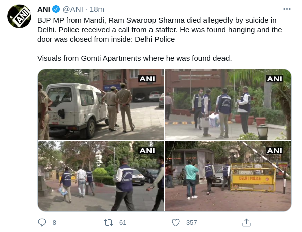 नई दिल्ली, एजेंसियां। भाजपा सांसद राम स्वरूप शर्मा के निधन के बाद आज होने वाली पार्टी की संसदीय दल की बैठक रद कर दी गई है। समाचार एजेंसी एएनआइ ने दिल्ली पुलिस के हवाले से जानकारी दी है कि राम स्वरूप शर्मा की मौत कथित तौर पर आत्महत्या के कारण हुई है। पुलिस को भाजपा सांसद के एक कर्मचारी ने फोन किया। पुुलिस गोमती अपार्टमेंट्स पहुंची तो वह फंदे से लटके मिले और दरवाजा अंदर से बंद था। हालांकि, अभी तक कोई सुसाइड नोट नहीं मिला है।पोस्टमार्टम के बाद ही मौत के सही कारणों का पता लग सकेगा। वह वर्तमान में विदेश मामलों की स्थायी समिति और विदेश मंत्रालय की सलाहकार समिति के सदस्य थे।