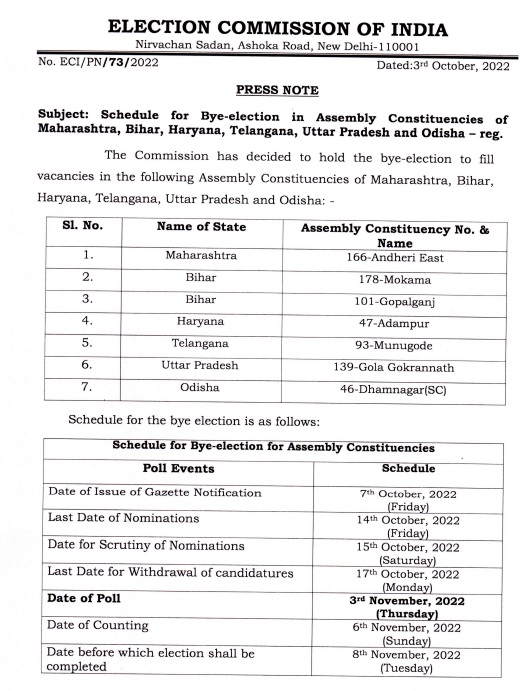 छह राज्यों की जिन सात सीटों पर विधानसभा के चुनाव होने हैं। वो महाराष्ट्र में अंधेरी पूर्व, बिहार में मोकामा और गोपालगंज विधानसभा सीट हैं। इसके साथ ही हरियाणा में हिसार लोकसभा सीट के अंतर्गत आने वाली आदमपुर विधानसभा सीट और तेलंगाना में मुनुगोड विधानसभा सीट पर उपचुनाव की घोषणा हुई है। वहीं, चुनाव आयोग द्वारा उत्तर प्रदेश में गोला गोकर्णनाथ ( Gola Gokrannath) और ओडिशा में धामनगर सीट में उपचुनाव का एलान किया गया है।