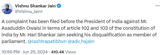 इसी बीच, ओवैसी के खिलाफ राष्ट्रपति से शिकायत की गई है। सुप्रीम कोर्ट के वकील विष्णु शंकर जैन ने एक पोस्ट में लिखा कि संविधान के अनुच्छेद 102 और 103 के संदर्भ में असदुद्दीन ओवैसी के खिलाफ राष्ट्रपति के समक्ष शिकायत दर्ज की गई है। उनकी संसद की सदस्यता रद्द करने की मांग हुई है।