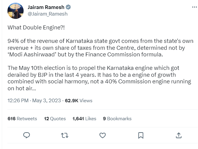 बता दें कि डबल इंजन एक शब्द है जिसका इस्तेमाल अक्सर बीजेपी नेता केंद्र और राज्य में पार्टी के शासन को संदर्भित करने के लिए करते हैं। कांग्रेस के संचार प्रभारी महासचिव जयराम रमेश ने भाजपा की पिच की आलोचना करते हुए ट्विटर पर कहा, क्या है डबल इंजन? कर्नाटक राज्य सरकार का 94% राजस्व राज्य के अपने राजस्व और केंद्र से करों के अपने हिस्से से आता है। यह 'मोदी आशीर्वाद' से नहीं बल्कि वित्त आयोग के फॉर्मूले से तय होता है।